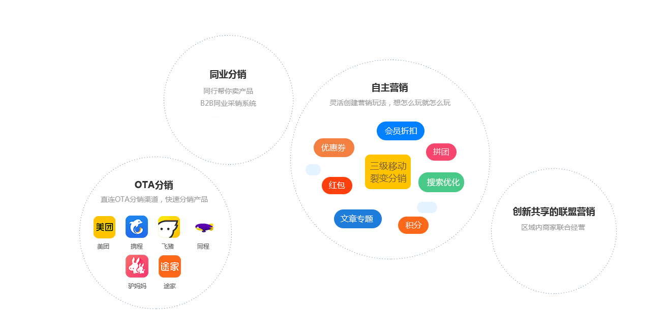 提供OTA分銷、同行渠道分銷、自主營銷玩法(移動裂變分銷、優(yōu)惠劵、秒殺等)、創(chuàng)新共享聯盟營銷等多種營銷策略,
